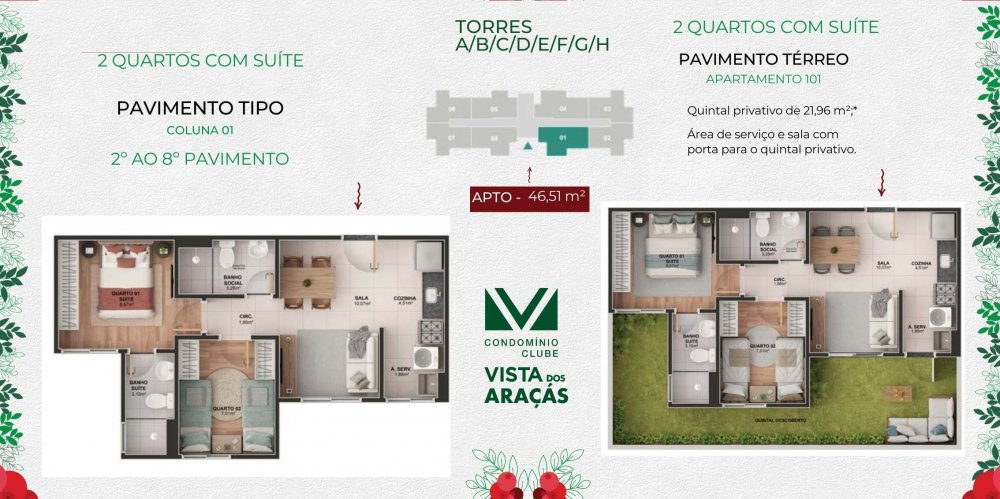 São apartamentos de 2 e 3 quartos com opções com quintal privativo, suíte e escritório/quarto de serviço. O novo condomínio-clube ainda tem uma super novidade: piso em porcelanato na cozinha e sala e piso laminado nos quartos.